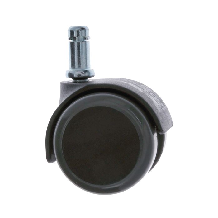 Rueda de nylon negro con banda de poliuretano gris, con espiga, ideales para mobiliario y mueble de oficina.