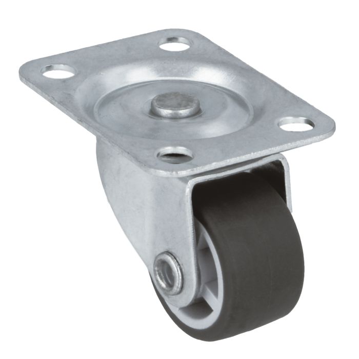 'Rueda de goma gris con núcleo de polipropileno negro y con pletina giratoria de acero zincado, ideales para mobiliario y mueble de oficina'
